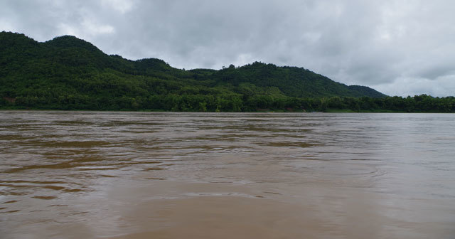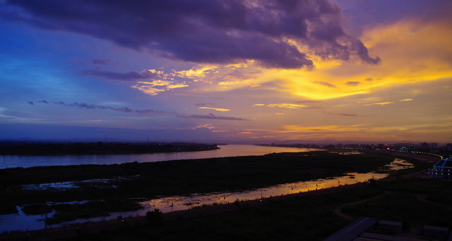 メコン河の向こうに落ちる夕日に空が赤く染まった。