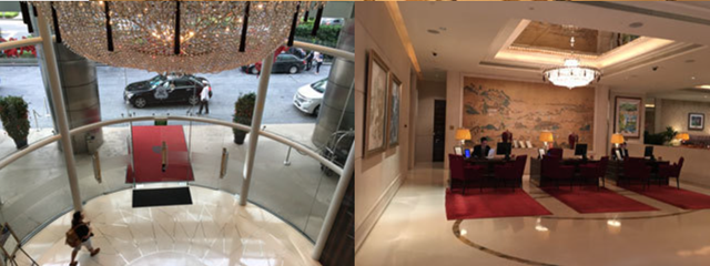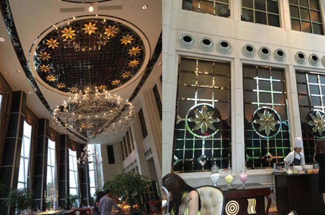 ホテルの正面玄関から入って、真っ直ぐ進んだ先にあるダイニング・スペースは、高い天井と大きなガラス窓から入る採光と複雑な内装が異なる空間を演出し、独特の雰囲気を醸し出している。