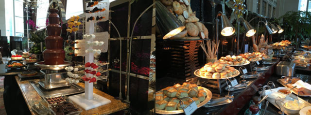 数種類のスコーン、パンやスモークサーモン、チョコレートフォンデュタワーなど、とても全てを食べるのは至難の業