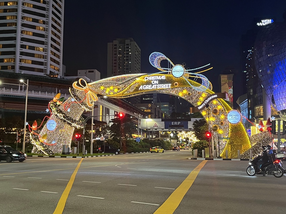 12月のOrchard Road(オーチャード・ロード)はクリスマスの飾りつけで、きらびやかなこの時期見どころのひとつが、4つ角に毎年設けられる光のゲート 色が順にかわっていく。