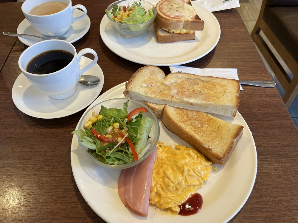 たっぷりたまごのハムチーズトーストサンドとトースト&スクランブル、1セット分はカフェオレに変更