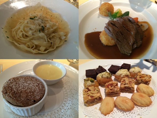 前菜のパスタ、メインのステーキ、デザート、そしてコーヒーもしくは紅茶。