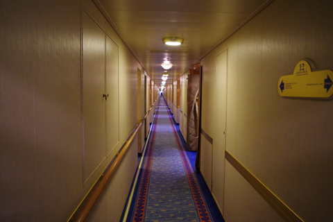 客室への通路(エレベーターを降りて片方側半分を写したもの)は改めてこの船の大きさを実感させる。