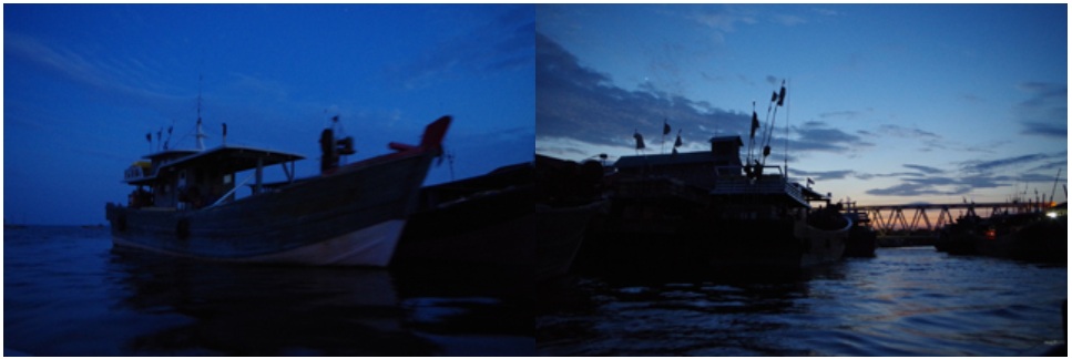 海に出ると、修理の為かここに持ってこられたケロン(漁師が使う寝泊り可能な移動式漁施設)や水上生活者の住居を舟から見て回った。