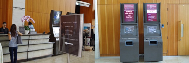 その横にある2台の機械は、自動チェックアウト、使用した金額がわかるもの(1階のロビーに何台か設置してある)