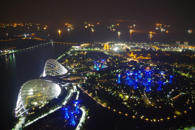海上に浮かぶ船、Marina Barrage(マリーナ・バレージ)、Garden by the Bay(ガーデン・バイ・ザ・ベイ)がSF映画の宇宙基地の様