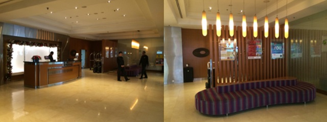 エレベーターは正面玄関=1階から5階(ノボテル使用部分)・6階・7階へ、スクエア(レストラン)裏=6階・7階からショッピングモール内へ、レセプション奥=6階7階から25階までの各部屋へ これら3箇所