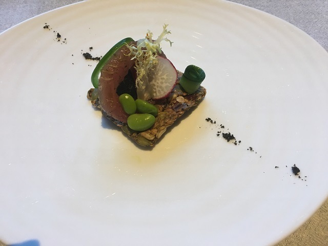 Appetizer/Raw tuna on vegitable and seed flat bread