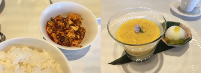 普洱茶(プーアル茶) 6.00ドル 2つ 12.00ドル八宝湯(八種薬膳入りスープ) 9.80ドル本日のスープ(冬瓜スープ) 20.00ドル韮黄豆芽(黄ニラともやしのシャキシャキ炒め) 16.00ドル陳麻婆豆腐(四川飯店伝統のマーボードーフ) 22.00ドル北海道ライス 3.50ドル 2杯 7.00ドル湯枝甘露(タピオカとレモンソルベ入りマンゴースープ) 6.00ドル++ 10%サービス料金 7%GST(消費税) が加算されて、合計 109.25ドル *ドルはシンガポールドル