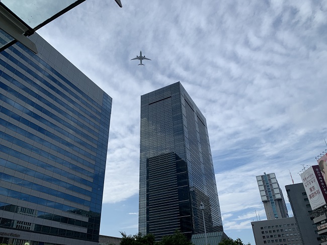 品川の駅の上空は飛行機の通り道のようで、空を見上げると飛行機が見えた。